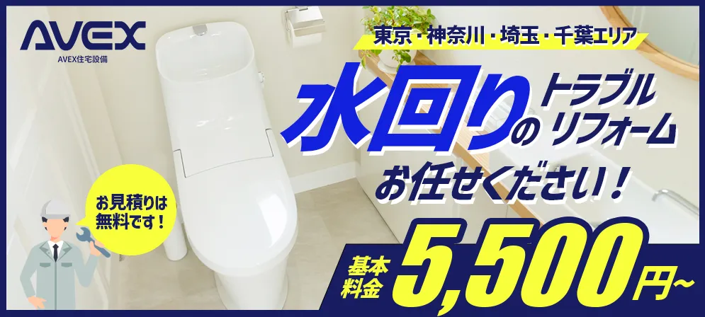 AVEX住宅設備は、24時間365日対応してくれる業者です。水回りのトラブル解決やリフォームに加え、電気工事や害虫駆除など幅広く対応してくれるので、複数のトラブルが重なって困っているという方にもおすすめ。見積もりは無料なので、とりあえず料金を確認したいという方も気軽に問合せしてみてくださいね。