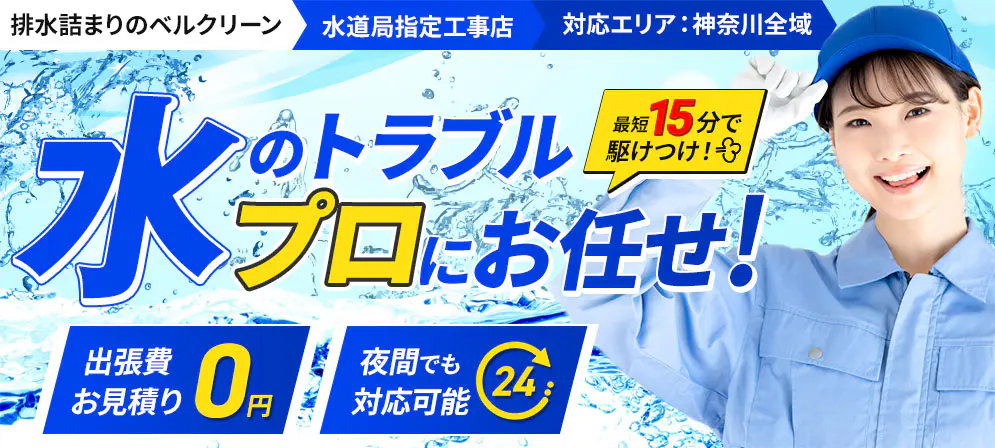 神奈川県全域で水回りのトラブル解消をおこなう「排水詰まりのベルクリーン」は、地域密着型の水道局指定工事店です。藤沢市近郊であれば最短15分で駆けつけ。急なトラブルの際も安心です。夜間駆けつけも割り増しなしで対応しています。まずは無料のお見積もりから、ぜひお気軽にご利用ください。