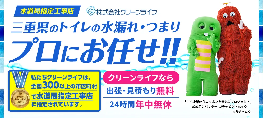 トイレつまり、水回りのトラブルに強い専門業者として、全国的に事業展開するクリーンライフ。その最大の特徴は、その圧倒的な顧客満足度です。24時間365日、いつでもお客様の元へ駆けつけ、深夜、早朝、祝日休日には割増料金をいただくことは一切ありません。出張費用や見積もりも無料で提供し、キャンセルにも料金は発生しません。クリーンライフは三重県の各市町村から指定を受けた指定給水装置工事事業者(水道局指定工事店)として、料金体系は安心の実直な明朗会計です。アフターフォローも充実しており、修理内容に応じて1~3年の無料点検、無料保証を用意しています。経験豊富なスタッフが、施工実績30万件以上の確かな実績をもとに、水道トラブルに関するあらゆる問題を解決いたします。安心して水回りの問題をクリーンライフにお任せください。