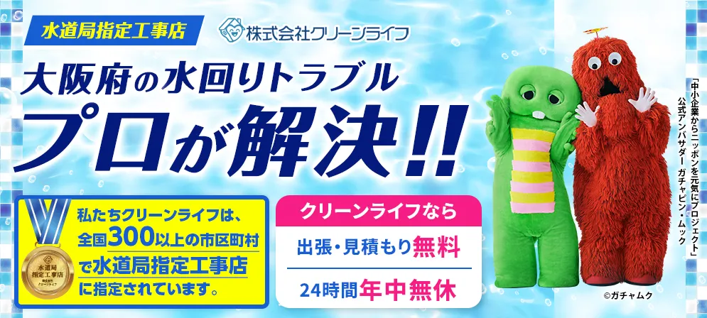 水回りのトラブルでお困りの際、信頼できる水道修理業者の一つがクリーンライフです。全国展開し、圧倒的な顧客満足度を誇り、24時間365日、深夜、早朝、祝日休日にも割増料金が一切かからない安心のサポートを提供しています。出張費用・見積もりは無料で、キャンセルにも料金はかかりません。クリーンライフは大阪府の各市町村から指定を受けた指定給水装置工事事業者(水道局指定工事店)として、業界の中でも比較的安く、明朗な料金体系を持つ実直なサービスを提供しています。施工実績30万件以上の確かな実績をもとに、経験豊富なスタッフが、水道トラブルに確実かつ迅速に対処されています。アフターフォローも充実しており、修理内容に応じて1~3年の無料点検、無料保証を用意しています。トイレや水回りのトラブルはクリーンライフに依頼してみてはいかがでしょうか?
