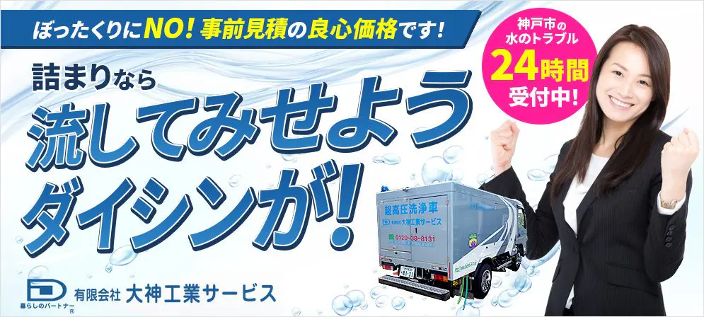 1992年に設立された大神工業サービスは、兵庫県の神戸市を中心に営業されていて、緊急性の高い水回りのトラブルから貯水槽・汚水槽・雑排水槽の定期清掃、排水設備メンテナンスや水質調査まで幅広く対応してくれます。