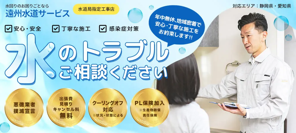 遠州水道サービスは静岡県、愛知県にてあらゆる水回りのトラブルに対応可能で、水道局指定工事店に認定されており、「悪徳業者撲滅宣言」を掲げるだけあって、安心してご依頼いただけます。しかも出張・見積もりが無料で、お支払方法も現金だけでなくクレジットカードにも対応しています。さらにキャンペーンで最大3,300円OFFになり、何度でも割引適用なので嬉しい限りですね!営業時間は8:00~21:00ですが、時間外対応も可能ということなので、ぜひお気軽にお問い合わせてみてください!