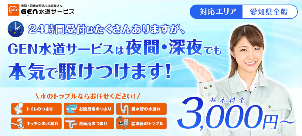 GEN水道サービスは愛知県全般を対応エリアとして営業する水道修理業者で、トイレのつまりだけでなく、お風呂場、キッチン、洗面所、給湯器、排水管まで幅広く水道修理に対応できる業者。