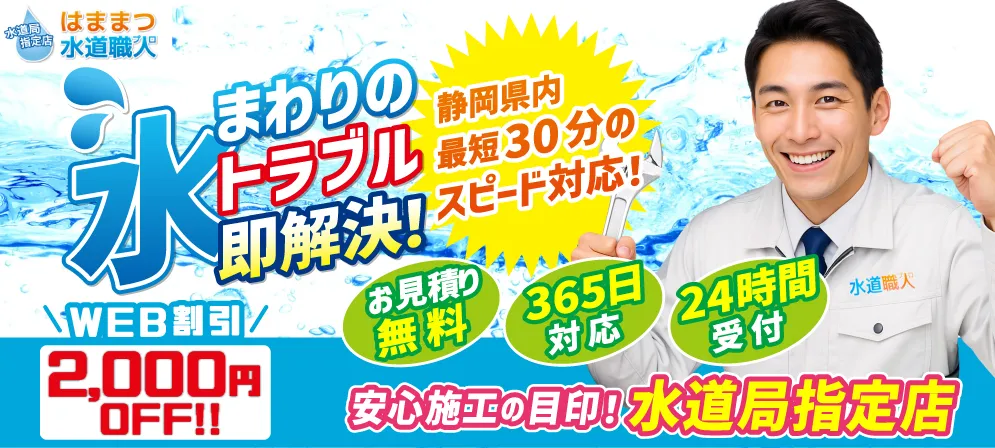 水道修理のプロ集団「はままつ水道職人(浜松水道職人)」に、浜松で発生した水道のつまり・水漏れなどの水のトラブル解決ならお任せください!数多くの作業実績を持ち、日々豊富な技術と経験を磨き続ける自社のプロスタッフが、トイレのつまり、蛇口の水漏れ、排水の詰りなど、水回りトラブルに対して最適な修理方法・作業方法を判断しトラブルの解消をいたします。