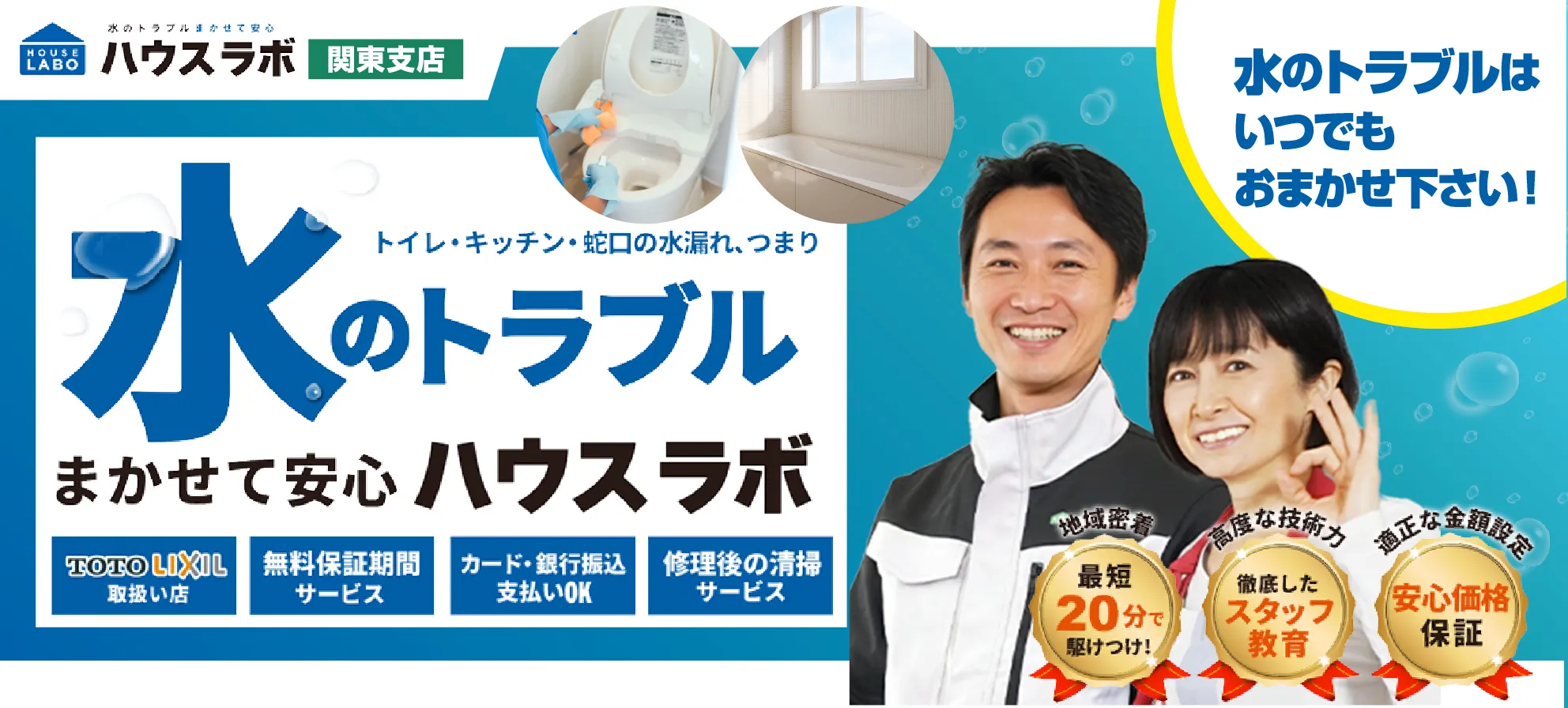 ハウスラボ 関東支店は全国展開している大手の水道業者です。大手の会社だからこそできる、24時間年中無休の対応のサービスがあるので、急なトイレつまりや夜間の水漏れ等に迅速に対応してくれます。また24時間365日対応を謳っている企業は多くありますが、夜間や早朝、休日などでは割増料金を取っていることが多くあります。しかし、ハウスラボでは割増料金がかからないのでいつでもすぐに駆けつけてくれるのです。もちろん作業前に見積もりを作成してくれるため、修理の施工後に高額な料金を請求された!!なんていうトラブルの心配もありません!身だしなみや清潔さにも気を使っている施工スタッフが、丁寧でお客さんを第一に考えた親切な対応をしてくれます。適正価格で、しっかり直してくれるハウスラボに依頼してみてはいかがでしょうか?