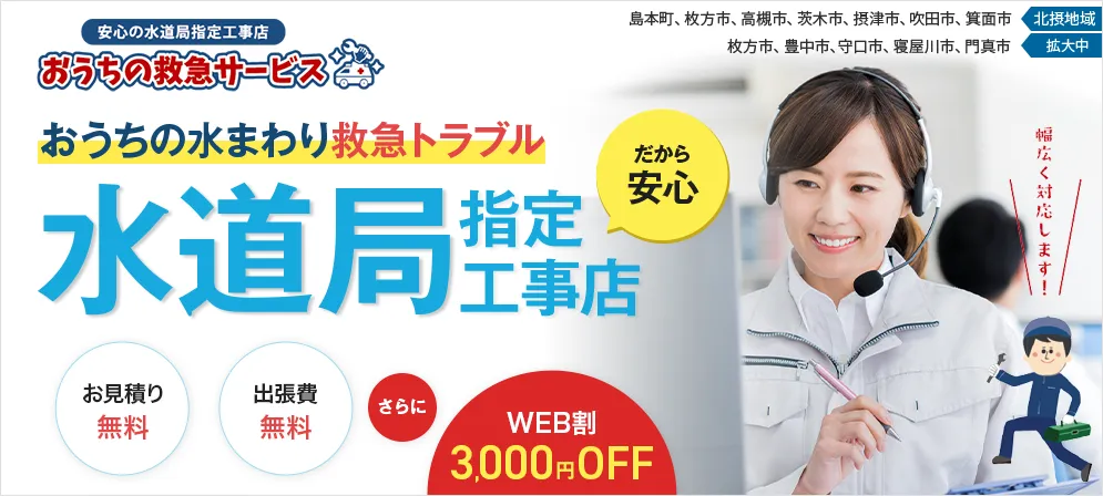 おうちの救急サービスは、高槻を中心に島本町、枚方市、高槻市、茨木市、摂津市、吹田市、箕面市、寝屋川市、門真市、守口市、豊中市のエリアで、水回りのトラブルを解決しています。
