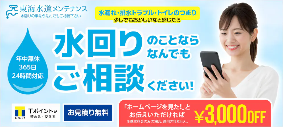 水道局指定工事店に指定されている東海水道メンテナンスは、愛知県・名古屋を中心に営業活動されている業者で、トイレ・キッチン・浴槽・洗面所・給湯器・排水管等あらゆる水回りのトラブルを解消してくれます。土日祝・早朝・深夜でも、割増料金は一切かからないのでありがたいですね!事前に作業内容と料金をご案内し、ご了承いただいた上で作業を開始、万が一お見積り内容が希望に沿わずキャンセルしたい場合も費用は発生しないので、愛知県名古屋近辺にお住まいの方はぜひ検討してみてください!