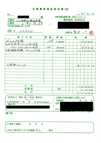 お見積りに記載した以上の金額をご請求することはありません。弊社では作業前に事前説明とお客様から承諾のサインをいただいてから作業開始となります。ご了承をいただいていない施工や必要のない部品交換、お見積りに記載のない費用などは発生しません。