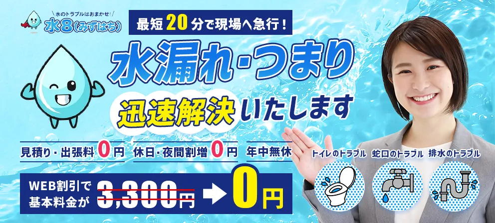 水8(みずはち)は経験豊富で知識もたくさん持っているスタッフが迅速に現場へ駆けつけ、素早くトイレつまりなどのトラブルを解消してくれます。また相談をしてから約20分〜1時間程度で、現場に到着してくれます。最短で30分と謳っている業者が多い中、どの案件に対しても概ね1時間以内で到着するというスピードを謳っているということは速さの自信の現れとも言えるでしょう。もちろん施工のスピード感もあり、技術力も折り紙付きです。そんな水8(みずはち)の一番の魅力はキャンぺーンの割引料金と言えます。このレベルでの品質を保ちながら、最大3,300円の割引はなかなか実現できません(こちら詳しくは公式サイトへ)。安さ、品質ともにトップレベルであると言えるでしょう!