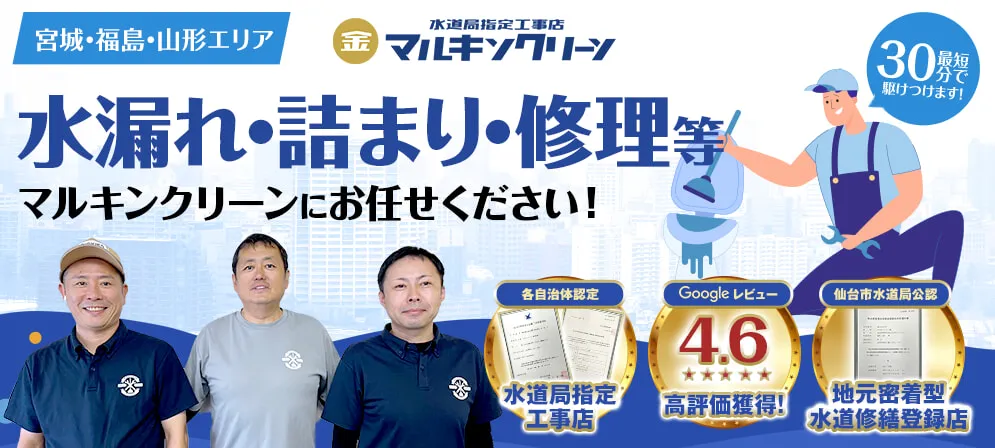 マルキンクリーンは宮城県・福島県・山形県で水漏れ修理、排水管洗浄、トイレ・キッチン・浴室のリフォームを365日年中無休で24時間対応している水道局指定工事店です。地元で20年、年間1,500件の修理実績があり、出張・お見積もりは無料です。