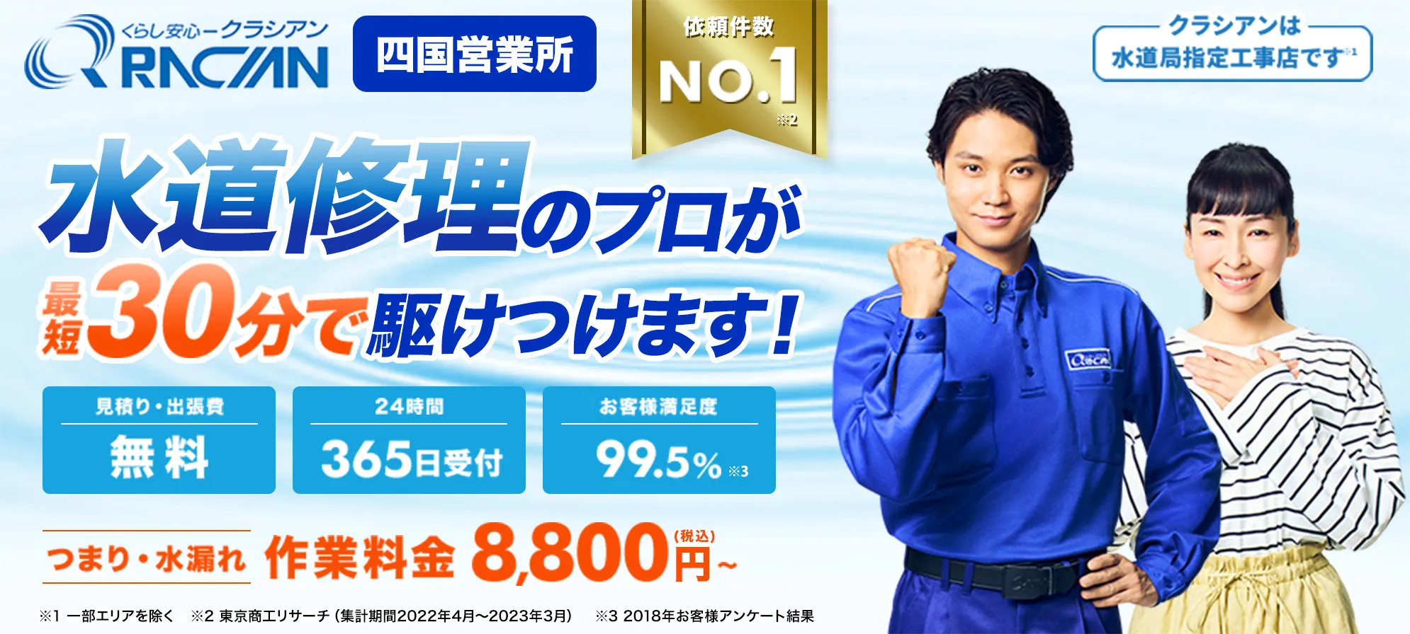 四国エリアでは、給水管の修理などの水道工事は、クラシアンのような水道局指定工事店にしかできません。あらゆる水まわりトラブルに対応できますので、安心してご依頼ください。