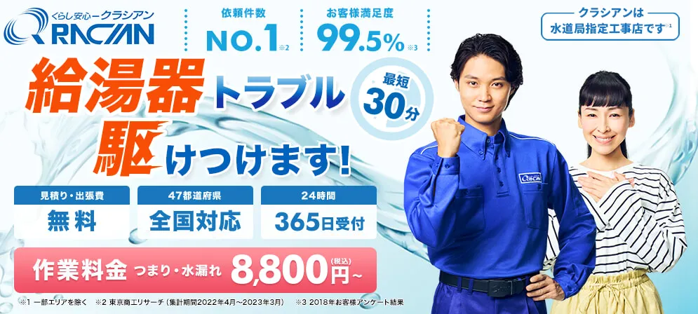 言わずと知れた、CMでおなじみの大手企業ですが、実際に依頼した事はないという方も多いと思います。クラシアンは、全国47都道府県に点在している業界最大規模のネットワークと、豊富な修理実績から得られたノウハウが他社にはない魅力と言えるでしょう。価格帯としては多少他店よりも高めに感じるかもしれませんが、アフターケアも万全で、スタッフが駆けつけるまでの時間に自分でできる応急処置について丁寧に教えてくれるサービスが好評のようです。またそれ以外でも、公式サイトに掲載されている数々のトラブルシューティングの記事や普段のお掃除のアドバイスに至るまで幅広く、主婦や一人暮らしに嬉しいコンテンツを提供しています!一度は耳にしたことある業者さん、実際にご依頼してみてはいかがでしょうか?
