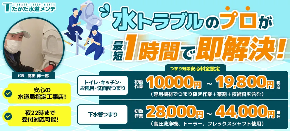 「たかた水道メンテ」は東京にてあらゆる水回りのトラブルに対応可能で、最短30分で駆けつけも可能。水道局指定工事店に認定されており、安心してご依頼いただけます。料金体系も明朗会計でわかりやすく、数百円~という値段を表記して実際には法外な請求をするという業者が増えている中で、現実的な料金を提示しているので信頼できるかと思います。東京にお住まいの方でお困りの方はぜひご検討されてはいかがでしょうか。