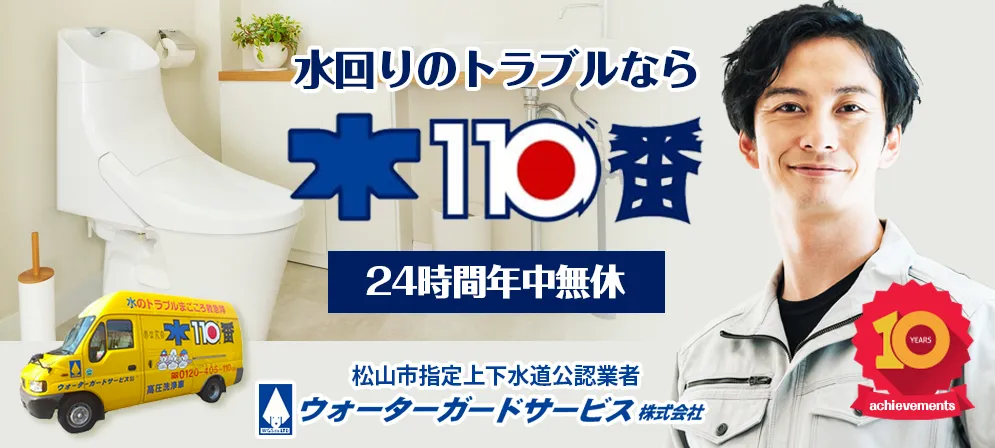 あなたの水110番は愛媛県松山市に拠点をおく業者で、水回りのトラブル対応をはじめ、衛生設備工事、給排水設備工事、水道衛生工事・保守、水道衛生設備工事、水道衛生設備保守、排水管つまり清掃など水回りのことについて幅広く取り扱っています。