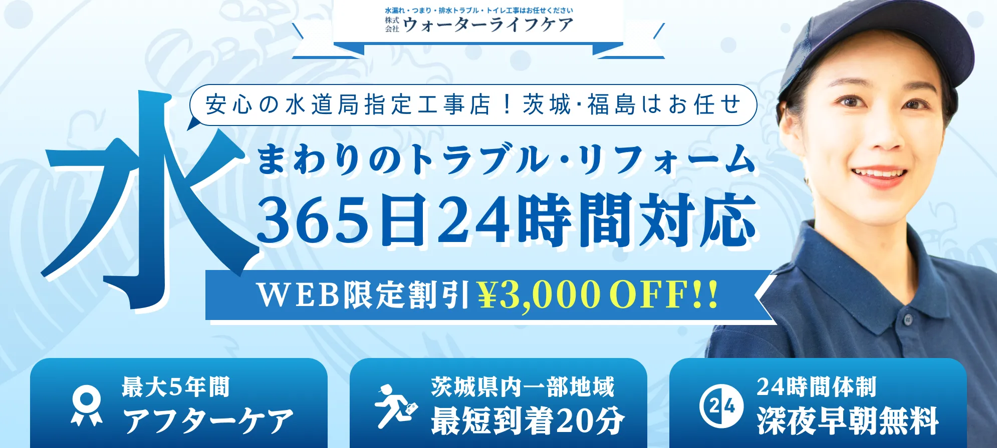 ウォ—ターライフケアは、茨城県福島県で、水回りのトラブルの対処から水道工事に加え、水回りのリフォームまで行っている会社です。蛇口水漏れ修理・蛇口本体交換・トイレ水漏れ修理・トイレ本体交換・給排水漏れ修理・給排水修繕工事・温水便座修理・温水便座本体交換・給湯器修理・給湯器本体交換・電気温水器修理・電気温水器本体交換・浄化槽関連・井戸ポンプ修理・井戸ポンプ本体交換など水回りの事ならなんでも対応してくれます。また、スタッフに対しては、お客様に不快感を与えない身だしなみ教育を徹底されているということです。「安心・信頼」「迅速な対応」「確かな技術」「低価格」を心がけているウォーターライフケア、茨城県福島県で、水回りのことでご相談があればお問い合わせされてみてはいかがでしょうか?