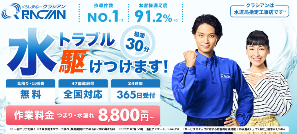 クラシアンは日本全国に展開している水道修理業者です。24時間年中無休で、水道トラブルに対応しています。